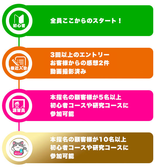 体験入店・お試しから最高ランクの「オトニャン」までの道のりをご説明します。