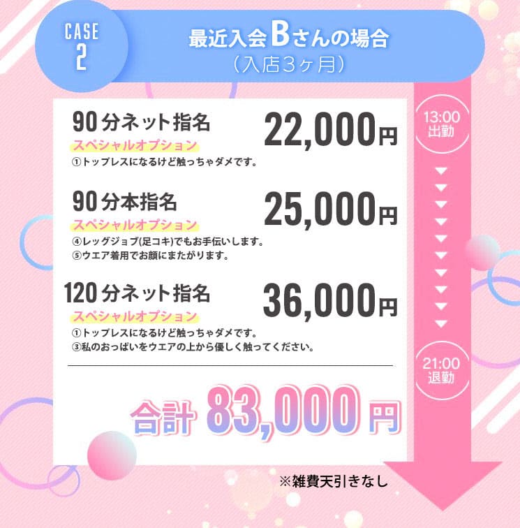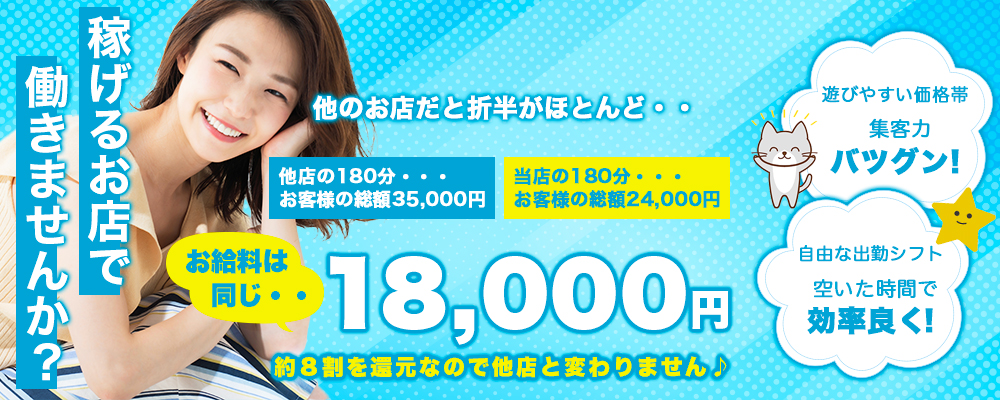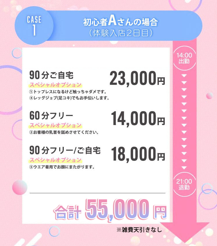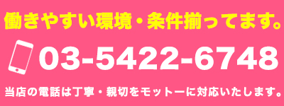 | 勤務日 | 100%完全自由エントリーなので、あなたの気が向いた時だけの勤務でOK! 何よりあなたを大切にする事・輝かせる事に関しては、他店には絶対負けない自信があります。 |